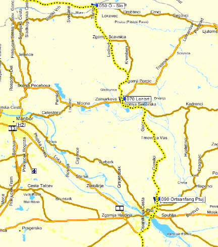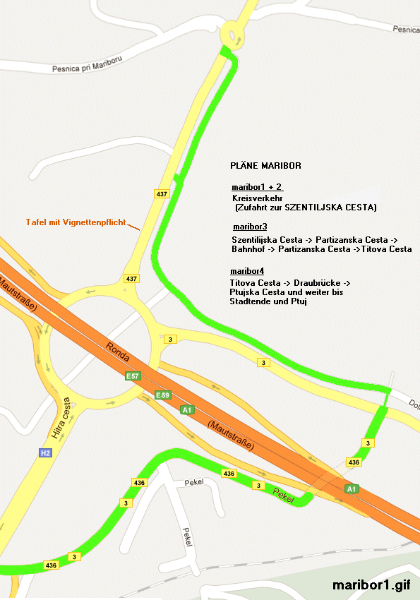 Datailkarten (von Willi Moser): Zwischen Ptui und Maribor gibt es auf der Bundesstrasse 437 keine Probleme. Achtung nach Pesnica pri Mariboru. Fahren Sie vorsichtig bis zu einem kleinen Kreisverkehr. Die dritte Ausfahrt führt auf eine kleine Straße (blaues Fahradhinweisschild) die parallel zur Hauptstraße führt. Sie sehen bereis in ca 250m einen großen Kreisverkehr mit Autobahnwegweisern.