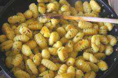 mit Olivenöl, dem Rosmarin und dem Knoblauch geben. Die Gnocchi anbraten.