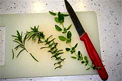 Pfanne von der Flamme nehmen und die Kräuter (Rosmarin, Oregano, Thymian