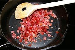 Schinken in kleine Würfel schneiden und in der Pfanne kross anbraten. Mit