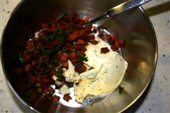 Frischkäse zugeben und mit dem Schinken und den Kräutern vermischen. Nach