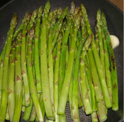 den Spargel leicht anbraten. Mit Pfeffer und Salz würzen. Drei bis