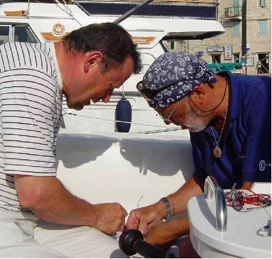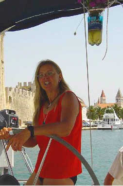 dreier Wind und bettete sich auf der B-Ablage. Ute am Steuer zog dann die Stirn in Falten, weil der Wind sooo nachließ. Ich erinnerte sie an ihr Lieblingsmanöver und es dauerte nur einen winzigen Moment, bis sich ihre Augenbrauen hoben und die Dame Seidler sprach: „also Beidrehen, Großschot los!“ Badefender raus und hinein in die Fluten. Nach Kuklica gegenüber Sukosan wollten wir zum Abschlussessen und rasten mit 2,5 Knoten darauf zu. Die Parkplatzsuche gestaltete sich nicht so einfach, weil an den Stegen nur hin und wieder eine Muring fand. Ute musste drei Anläufe nehmen und als endlich ein nicht reservierter Platz mit Leine gefunden war, lief ein großer Fischdampfer auf uns zu. Polako, raunte ich ihr zu und schwups, standen wir am Steg. Zwei Stunden gestand uns der radelnde Hafenmensch gratis zu. Anlegerschluck, Dorfrunde, Rosmarinpflücken für Gerhild und ein wirklich köstliches Mahl in einer Konoba am Hafen neben dem Touristbiro. Muscheln in herrlicher Knoblauchsauce, Grillteller, Fisch vom Rost. Und die feierliche Ausstellung und Überreichung der Seemeilenbestätigungen. Als es schön dunkel war, legten wir ab und blickten verwirrt auf ganz viele Lichter am Festland. Neonreklame, Autoscheinwerfer, Straßenbeleuchtung. Wo war denn unser Leuchtfeuer, das wir brauchten? Alle fünf Sekunden weiß, da war es! Herbert drehte am Ruder hin und her und fuhr Kringel in den Pasmanskikanal. „Mach doch einfach einmal nichts, Herbert“, sagte ich. „Ja, schon gut.“ Kurz bevor wir den riesigen Turm rammen konnten, übernahm ich das Steuer und zielte auf die Hafeneinfahrt zu. Der letzte Anleger eines Törns gehört mir. An unzähligen Yachten vorbei (schon nachmittags um vier waren so viele Stangerl in der Marina von weitem zu sehen, dass sich der Verdacht aufdrängt, die Schifferl waren gar nicht unterwegs) tuckerten wir bis zum Steg 9 und legten sauber an. 2200. Samstag, 24. Juni 2006 Wenn ich einmal um 8 schon fertig bin, ist von den Charterleuten keiner da! Als uns das erste Mal an diesem Tag die Brühe in Strömen lief, kam um 0830 der Taucher, flutschte ins Wasser und kam mit nach oben gestrecktem Daumen neben uns wieder hoch. Na klar, was dachte der denn?
