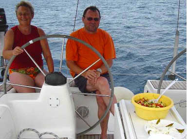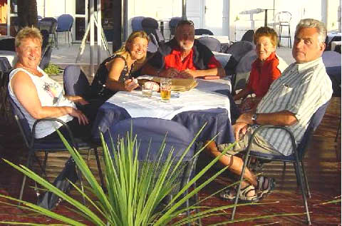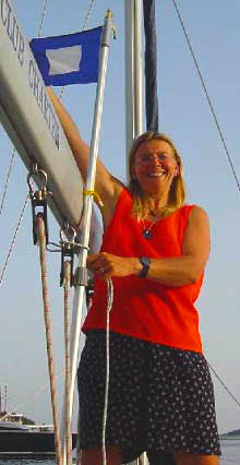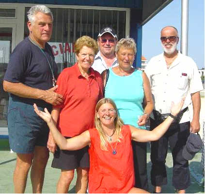 Die blaue Papa hatte ich zum Spaß wieder am Bootshaken aufgeknüpft und an den Baum gebunden. Schon kamen sie alle an. Abends um 8 trafen wir uns zum Abendessen an Bord: es gab gefüllte Paprika in feuriger Soße mit Reis, schon wieder von Gerhild und Max gezaubert. Tafelmusik kam aus unserem Cockpitlautsprecher. Herbert, der schwerhörige:“ Wir sind dem Orient nahe“. Ich:“ Warum?“ Herbert:“ Na die Musik klingt so orientalisch.“ Es war ein Blockflötenkonzert von Johann Sebastian! Nach dem Essen packte ich mein selbst erdachtes und ausgeführtes Seglerspiel aus, aber nachdem die Seidlers den Abwasch machten, spielten wir nur zu viert. Da gibt es Fragen zu Segelbegriffen, Ausweichregeln, Bordleben und zum Thema „wie bleibe ich beliebt.“ Neptun moralisiert mit Sprüchen, es werden Vor- und Zurückrückpunkte vergeben bei bestimmtem Verhalten und das Ziel ist, möglichst viele Seemeilen zu sammeln, die wiederum Belohnung für richtiges Beantworten der Segelfragen sind. Irgendwann mache ich meine geistige und ausgeführte Anstrengung noch einmal zu Geld. Irgendwann. Kostprobe aus dem Spielverlauf: Wozu dient ein Verklicker? Sagt die Gefragte: „zum Festhalten.“ J Mit einem Glas Schlibo begab ich mich zu Bett und zu meinem Buch, während meine Crew noch einmal ausschwärmte. Sonntag, 18. Juni 2006 Um 0900 brannte die Sonne schon