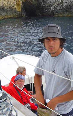des Hauses: Fischpastetenkügelchen mit Weißbrot. Auch sehr fein! Aber die zwei langen Platten mit Gambas, Thunfisch, Brasse, Tintenfischragout, Kartoffeln und Mangold schossen den Vogel ab. Seidlers (sie reden sich gegenseitig grundsätzlich mit Herr und Frau Seidler an) und Gerhild und Maax (zwei Silben) schafften ihre Portionen nicht. Josef und ich teilten uns eine große Auflaufform Fischlasagne uns, die ebenfalls schlecken ließ. Übrig ließen wir nur ca. 100 g geschmolzenen Käse weil wir einfach nicht mehr konnten. Das Restaurant mit der freundlichen Bedienung heißt Falkusa und ist das zweite neben dem großen Turm, wer mal super essen gehen möchte. An Bord wurden die Vorräte von Rosmaringrappa mit Anis aus Milna heftig dezimiert. Samstag, 17. Juni 2006 Zum Frühstück legten wir in die Flaute hinein ab, weil es am Meer so schön ruhig war. Mit unmessbaren 0,0001 Knoten dümpelten wir der kleinen Insel Bisevo entgegen, um dort die blaue Grotte zu besichtigen. Die Segel standen dennoch auf Backbord und peilte man eine Landmarke, war sicher, dass wir uns bewegten, wenn auch auf der Logge 0,0 zu lesen war. Der Himmel graute heute. Wahrscheinlich war die Grotte heute ebenfalls grau und nicht blau. Um halb zehn waren wir dann auch angelangt. Mit Ankern war nichts drin bei 30 Meter tiefe direkt vor den Felsen und so beschlossen wir, dass nur jeweils die Hälfte der Crew in die Grotte fuhr und die andere auf das Schiffle aufpassen sollte.