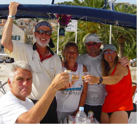 Schönstes Wetter und kein Wind. Doch kurz bevor wir in Milna (Hvar) ankommen, dreht der Ost auf Süd und bemüht sich von 1 auf 4. Na denn, Genua wieder rausgezerrt (unsere Refftrommel sperrt sich, weil der Winkel der Reffleine auf die Trommel nicht stimmt. Wir bauen das ganze um) und mit 6 Knoten 120° gesaust. Max zauberte einen geruhsamen Backbordlängsseitsanleger: 1200 fest in Milna. Einkaufen, Städtchen schauen. Josef und ich taten einen Weinbauern in einem winzigen Innenhof auf, der uns seinen Keller aus dem Mittelalter aufsperrte und sämtliche Weine, Grappas und Olivenöle verkosten ließ. Das mag ich. Etliche Liter Weines, Grappas und Öles schleppten wir anschließend zum Schiff. Um 1520 gings weiter. Die Seidlers fragten höflichst an, ob sie vorlaufen und schwimmen gehen könnten und ob wir sie dann aufnehmen könnten. No klar, sprach der Skipper. Also hielten wir beim Auslaufen Ausguck nach zwei Köpfen im Wasser, die an der Huk tatsächlich gesichtet werden konnten. Als die beiden per Badeleiter an Bord steigen wollten, hatten wir noch 1 Knoten drauf. Hui, die zog es aber weg! SW 3 verhinderte uns dann Richtung Starigrad, der „alten Stadt“, der Jockel musste mitlaufen. Im Fjord endlich drehte der Wind und wir wollten partout die Genua nochmal setzen. So schönes Vorwindsegeln aber auch. Mehrere Yachten überholten uns und als wir dann um 1800 auch da waren, zeigte sich der Stadthafen bestens gefüllt. Uns entgegen kam ein Segler, der uns bedeutete, dass kein Platz mehr war, aber wir glauben ja nichts;) Ok, unser Anker tuts auch. Obwohl ein von mir absolut ungeliebter Pflugscharanker, hielt er meine geforderten 1800 U/min, mit denen unsere Schiffle gegen einen 8er Wind ankäme. Wir waren vollkommen dehydriert und es verlangte uns deshalb nach einem köstlichen Anlegerschluck. Unser Lied musste rezitiert werden, aber weil ich Josef beschwert hatte, dass es dann immer so lang (30 Sekunden) dauerte, bis man den Becher zum Munde führen konnte, regte ich an, jeder solle nur seine eigene Strophe, sprich, was er eben im Glas hat singen. (siehe Anhang).