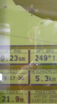 wo in der Karte eine Tiefe von 10 Metern erkennbar war und fing bei 7 Knoten Speed an zu schreien an: „3,7 Meter!“ Ich meinte, sie solle