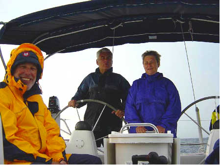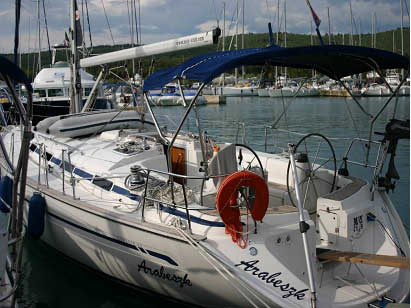 Ute und Herbert trafen ein, Gerhild und Max fuhren los, um die Resteinkäufe zu machen und als alles gestaut war, hielt der gewissenhafte Skipper eine längere Einweisung. Um 1830 legten wir bei NW 1 und bedecktem Himmel zu einem kleinen Probeschlag ab. In der Hafenausfahrt setzten wir die Genua und ließen uns schieben. Urplötzlich setzten Gewitterböen von N 6 unsere ARABESKE auf 35° Lage. Dabei war keine Böenwalze erkennbar gewesen und es regnete auch nicht. So was! Die Spazierfahrt war schon wieder zu ende, weil keiner Lust hatte, nass zu werden und die Genua durfte sich schnell wieder einrollen. Allerdings hakelte die Reffvorrichtung ziemlich. Später stellten wir fest, dass der Winkel der Leine zur Trommel nicht passt, weil eine Führungsrolle an der Reling abmontiert worden war. Wer macht denn so was? Am alten Platz wollte ich nicht anlegen, sondern suchte mir eine freie Stelle am Steg 8, wo ich gegen den Puster mit dem Heck anfahren konnte. Abends gab es von dem guten Speck, den Josef aus Kärnten spendiert hatte und wir beschlossen gemeinsam, was wir in den folgenden zwei Wochen anstellen wollten, nämlich Segeln, Baden, Orte anschauen in einer guten Mischung. Sonntag, 11. Juni 2006