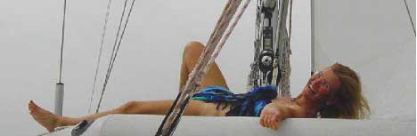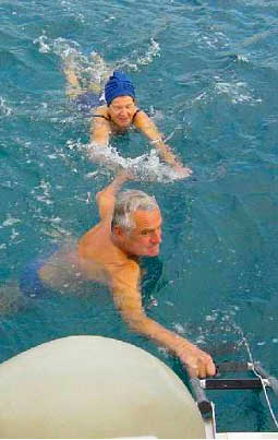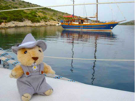 Leinen an einem Felsen fest gemacht, lagen wir guuut. Der Holzketschskipper schwamm um uns rum und wir ratschten ein bisschen. Ob er denn schon viel gesegelt sei in dieser Woche, wollte ich wissen. Ja, 2 Stunden. Vor einem 4er brauche er nicht anzufangen und einen 5er mute er dem alten Schiff nicht zu. Nach dem Badeprogramm und der Abendspeise stand eine Diashow mit viel Gelächter an. Donnerstag, 22. Juni 2006 Nach dem morgendlichen Bad