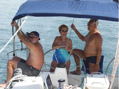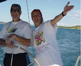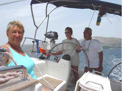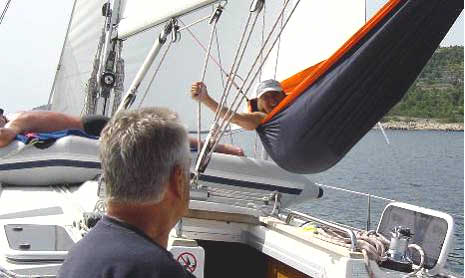 Beim Ablegen stritten Josef und ich wie die Kinder, wer die Leinen aufschießen durfte, veranstalteten einen Tauziehwettbewerb und hatten die größte Gaudi. Bis 1300 nahm der West auf untere 6 Bft. zu und Ute fuhr mehrere Wenden zwischen Drvenik Mali und diversen Felskrümpeln, die bedrohlich aus der Adria lugten. Mit zunehmender Wendenzahl machte es ihr immer mehr Spaß, die Männer an den Genuawinschen herum zu lassen. Herbert animierte sie dann zum Anluven, ich bot ihr an, doch lieber abzufallen, damit die „Handbremse“ aus dem Schiff kommt und als sie das Gefühl spürte, wie es ist, wenn so ein Segler zu ziehen anfängt, rasten wir mit über 6 Knoten SOG (speed over ground) dahin. „Ja, kann man denn bei so einem starken Wind auch beidrehen?“, fragte Ute. Na klar! „Dann fahr ich das jetzt“, meinte sie, steuerte den Bug durch den Wind, befahl, die Großschot auf zu machen, drehte das Rad nach Luv, setzte es fest und strahlte. Das Schiff lag ruhig, mein Lieblingsmanöver zum Mittagessen, aber unsere Würstl mit Senf und Brot nahmen wir trotzdem bei NW 5 und 7 Knoten Fahrt ein. Der Skipper persönlich hatte seine Kappe nicht festgebunden. Mitten in der schönsten Rauschefahrt machte sich das dumme Ding einfach über Bord. Geschrei! Wende, beidrehen, Josef den Bootshaken! Unser Josef hatte es sich auf der Blondinenablage, die zur Bubenablage verkommen war, gemütlich gemacht und geschlafen, brauchte 3 Sekunden, band flugs den Bootshaken los und fischte mein Käppi aus dem Wasser, auf das wir uns in beigedrehtem Zustand zu treiben hatten lassen.