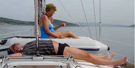 Der Wetteraushang an der Marina hatte keine Warnungen außer „stellenweise der Nebel möglich“ verkündet, so dass für die Nacht eine Bucht angepeilt wurde an der Westseite von Pasman. Mit Konoba. Josef spielte Alzheimer und sagte: „So merk ich’s mir: Pasman, Ankern, Konoba“. Rasmus ließ sich zu einem SW 3-4 herab und Gerhild kreuzte dagegen an. Die Lust stand ihr ins Gesicht geschrieben. Die Sonnenbank war wieder besetzt und ich wollte in meine Hängematte. Weil die Genua ja gesetzt war, musste ich mir ein anderes Fleckerl auf diesem Dampfer einfallen lassen. Am Mast und am Baumnock hängte ich die Schlaufen ein und ließ mich auf der Leeseite der Großschot herum schütteln. Gerhild: „Wende!“ Oh Mist, danach würde es mich dauernd gegen die Talje hauen. Mit heraus hängendem Bein konnte ich mich immer wieder abstoßen und trotzdem meinen Brunetti weiter lesen. Gott sei Dank rang sie sich zu einer weiteren Wende durch und so konnte ich wieder schön baumeln. Das Plätschern, das an mein Ohr drang, wurde immer lauter, so dass ich ein Auge riskierte. Murters Felsenküste zog in 60 Metern Entfernung an mir vorbei. Max stand mittlerweile am Rohr, sah meinen besorgten Blick und beruhigte mich: „13,5!“ Die Inselhuk war bald erreicht und danach schmökerte ich entspannt weiter. Griechischer Salat. Der Tageswind hielt nicht lange und bald suchten wir nach Ausweichbuchten. Bei 3 Knoten Fahrt und noch 2 Stunden Segelverlangen lag Vrgada auf dem Weg. Eine Boje vor der roten Wand an der Nordostspitze war noch frei und weil die Konoba noch nicht abgeschrieben war, fischten wir die rote Kugel auch, weil es in den Ort mit dem Beiboot kürzer war als von der Nordbucht aus. Noch an der Reling angeschraubt, probierte Herbert den Aussenborder. „Aus!!“ schrie ich, als derselbe nach dreimaligem Zerren am Anlasser ansprang. „Nu jo, ich hab doch nur mal probiert!“. Er verstand meine Aufregung überhaupt nicht. Und schon war er mit einem Hechtsprung im Wasser. Dummerweise hatte er vergessen, den Benzinhahn und den Choke zu schließen. Als wir den Flautenschieber dann auf dem Dinghi hatten, sprang er natürlich nicht mehr an. Die Seidlerischen Köpfe schwammen davon, einer mit der Hallebadkapp, einer ohne. Der Rest trank den Anlegerschluck aus, als ein vorbeirauschendes Motorboot eine derartige Welle stehen ließ, die schnurstracks auf unser Heck zulief und Beiboot samt Aussenborder zu einer halben Eskimorolle brachte. Leider nur zu einer halben. Kopfüber blieben beide liegen. Glas weg, aufgesprungen und das Gummiding wieder umgedreht! Josef war optimistisch: „na, vielleicht springt er ja jetzt an“, versucht’s und – knatter knatter, das dumme Motörle lief. Voller Freude stürzten sich Max und ich splitterfaser ins Boot um eine Runde zu drehen und die Zündkerze durch zu blasen. Fünf Minuten Richtung Ufer lief es prächtig. Dann erspähte ich die Seidler’schen Köpfe und schob den Gashebel langsam zurück. Plup, weg. Von jeder denkwürdigen Sekunde an schaffte es keiner mehr, dem Tomos Leben ein zu hauchen.