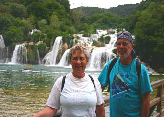 Kurz vor 9 brachen wir Richtung Süden auf, wohin uns ein frischer ENE mit 4 bis 6 Bft. mit Rauschefahrt zog. Im Durchschnitt mit 7 Knoten lief die ARABESKE, so dass wir mittags an der Westküste von Murter in der Uvala Kosirina zu Kartoffeln mit Zaziki den Anker fallen ließen. Linzer Schnitten von Josefs abwesender Frau Waltraud gab es zum Nachtisch. Es ging uns schon schlechter! Für diese Gelegenheiten hatte Gerhild einen kleinen Stoffbiber mit Sepplhut am Bandl mitgebracht, der zu jodeln anfing, wenn man ihm auf den Bauch drückte. Der Schlußjuchzer war so ansteckend, dass wir jedes Mal mitjuchzen mussten. Wem es gerade am schlechtesten;) ging, drückte den Biberbauch. Der Wind hatte gedreht auf West und abgenommen. Um 1700 waren wir in Sepurine auf Prvic längs fest, verholten allerdings bis vor einen Poller, der mit einer gelben Markierung die Grenze des Parkverbotes darstellte. Mit 40 cm Wasser unterm Kiel kann man ja zufrieden sein, wenn man dafür keinen Ärger mit dem Fährenkapitän der Jadrolinia kriegt. Kaum an unserem endgültigen Platz fest, rauschte einer der weißen Dampfer an und ein größerer Menschentausch fand statt. In einer kleinen Konoba am Strand fand der Bilderbuchsegeltag seinen Abschluss. Montag, 12. Juni 2006 Bei strahlendem Sonnenschein wollten wir heute nach Skradin, die Krka-Wasserfälle bewundern, mussten aber durchgehend motoren, weil der mickrige Wind auch noch von Osten fächelte.