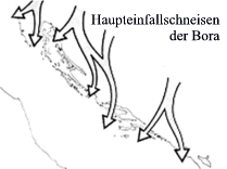 Dazu schreibt Werner Hilpp: Im Zusammenhang mit dem Starkwind Yugo sollte auch auf folgendes geachtet werden. Starker mehrtägiger Yugo wird nicht selten nach seinem Ende innerhalb von manchmal nur 2 - 3 Stunden durch fast ebenso starke Bora abgelöst. War die Bucht, Ankerplatz, bei Yugo noch gut und sicher so verliert diese nach dem Eintritt der Bora, wenn nach Norden bis Osten offen, jegliche Eignung und sollte daher spätestens bei Aufkommen von Wind aus Richtung Nordosten bis Nord sofort verlassen werden. Sonst kann das sehr unangenehm und gefährlich werden. |