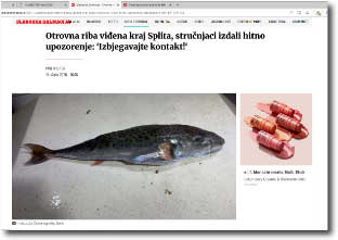 ![]() Vor Split ist wieder ein giftiger Fisch gefangen worden. Diese invasive Art wird wohl in naher Zukunft vor der gesamten Küste anzutreffen sein. Vor dem Kontakt und dem Verzehr des Hasenkopf-Kugelfisches wird dringend gewarnt. Zum Beitrag (HR) |